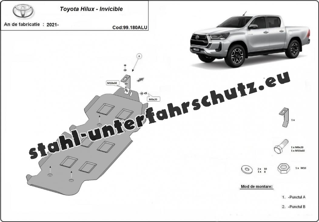 Die Abschirmung schützt: treibstofftank . Toyota Hilux Invincible - 2021 und 2025. Der Unterfahrschutz ist neu und passt perfekt für alle Toyota Hilux Invincible versionen, die zwischen 2021 und 2025 hergestellt wurden.Aus Aluminiumblech angefertigt mit einer Stärke von 3 mm. Die Schilde bestehen aus Aluminium, aber die Befestigungshalterungen bestehen aus Stahl. Schrauben, Mutter, Klips - alle Befestigungszubehör sind im Lieferung enthalten. Um mehr Schutz zu bieten gegen Korrosion wird der Unterfahrschutz elektrostatisch besprüht (Pulverbeschichtet) und bei 200o eingebrannt bzw. getrocknet. |
