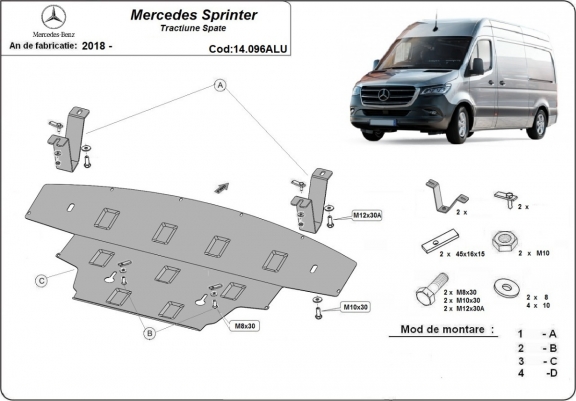 Die Abschirmung schützt: motor, kühler, vordere stossfänger . Mercedes Sprinter - RWD - 2018 und 2026. Der Unterfahrschutz ist neu und passt perfekt für alle Mercedes Sprinter - RWD versionen, die zwischen 2018 und 2026 hergestellt wurden.Aus Aluminiumblech angefertigt mit einer Stärke von 3 mm. Die Schilde bestehen aus Aluminium, aber die Befestigungshalterungen bestehen aus Stahl. Schrauben, Mutter, Klips - alle Befestigungszubehör sind im Lieferung enthalten. Um mehr Schutz zu bieten gegen Korrosion wird der Unterfahrschutz elektrostatisch besprüht (Pulverbeschichtet) und bei 200o eingebrannt bzw. getrocknet. |