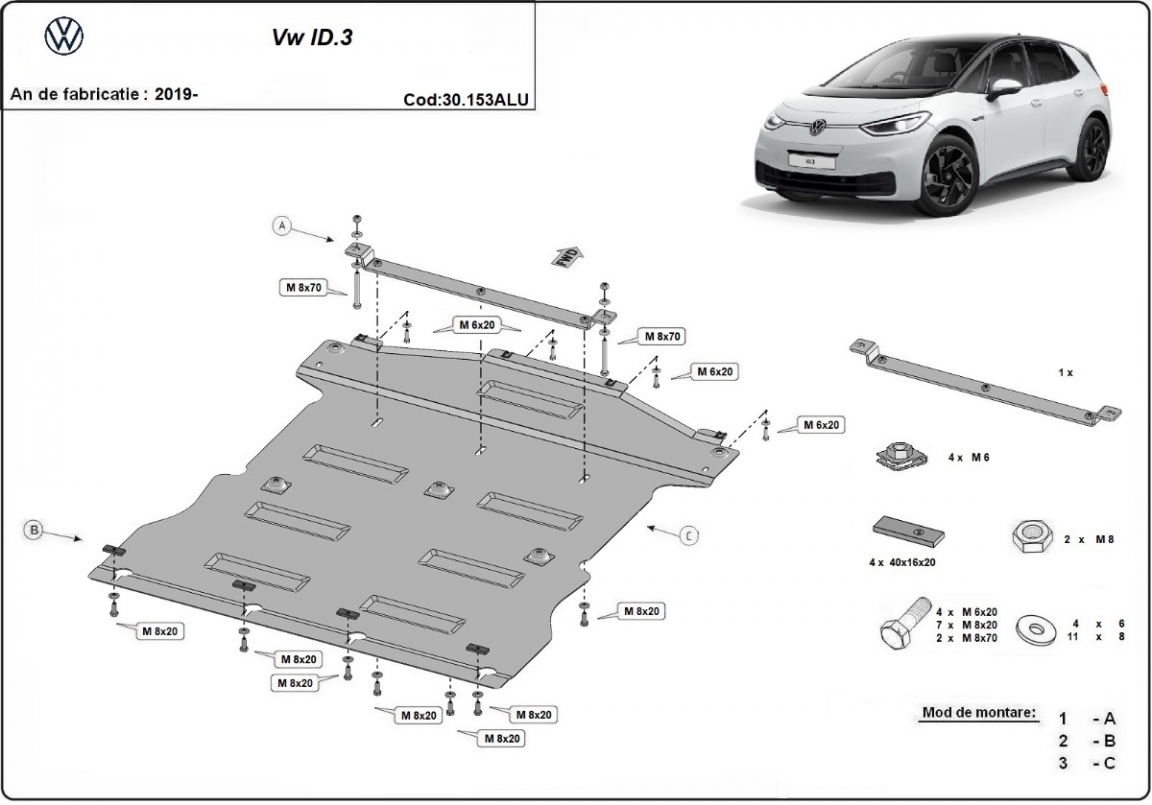 Die Abschirmung schützt: motor, getriebe, kühler . Volkswagen ID.3 - 2019 und 2026. Der Unterfahrschutz ist neu und passt perfekt für alle Volkswagen ID.3 versionen, die zwischen 2019 und 2026 hergestellt wurden.Aus Aluminiumblech angefertigt mit einer Stärke von 3 mm. Die Schilde bestehen aus Aluminium, aber die Befestigungshalterungen bestehen aus Stahl. Schrauben, Mutter, Klips - alle Befestigungszubehör sind im Lieferung enthalten. Um mehr Schutz zu bieten gegen Korrosion wird der Unterfahrschutz elektrostatisch besprüht (Pulverbeschichtet) und bei 200o eingebrannt bzw. getrocknet. |