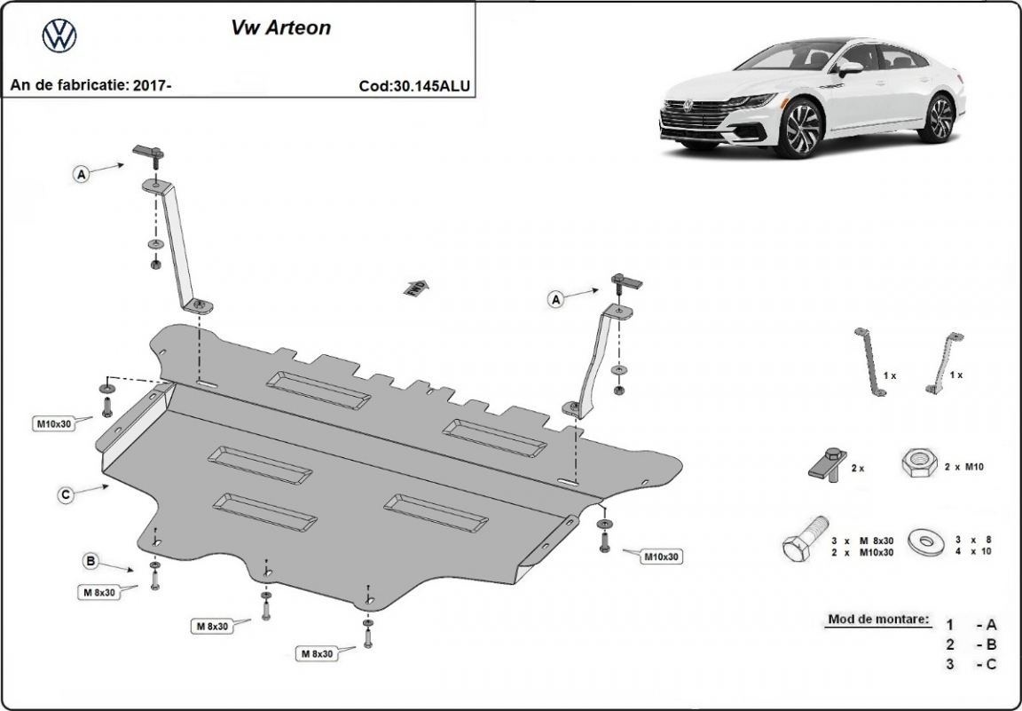 Die Abschirmung schützt: motor, getriebe, kühler, vordere stossfänger . VW Arteon - 2017 und 2026. Der Unterfahrschutz ist neu und passt perfekt für alle VW Arteon versionen, die zwischen 2017 und 2026 hergestellt wurden.Aus Aluminiumblech angefertigt mit einer Stärke von 3 mm. Die Schilde bestehen aus Aluminium, aber die Befestigungshalterungen bestehen aus Stahl. Schrauben, Mutter, Klips - alle Befestigungszubehör sind im Lieferung enthalten. Um mehr Schutz zu bieten gegen Korrosion wird der Unterfahrschutz elektrostatisch besprüht (Pulverbeschichtet) und bei 200o eingebrannt bzw. getrocknet. |