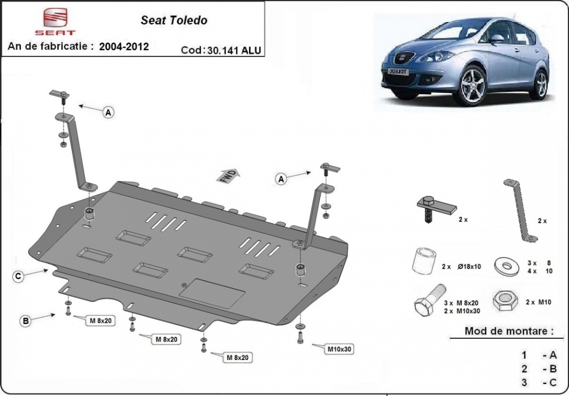 Die Abschirmung schützt: motor, getriebe, kühler . Seat Toledo 3 - 2004 und 2012. Der Unterfahrschutz ist neu und passt perfekt für alle Seat Toledo 3 versionen, die zwischen 2004 und 2012 hergestellt wurden.Aus Aluminiumblech angefertigt mit einer Stärke von 3 mm. Die Schilde bestehen aus Aluminium, aber die Befestigungshalterungen bestehen aus Stahl. Schrauben, Mutter, Klips - alle Befestigungszubehör sind im Lieferung enthalten. Um mehr Schutz zu bieten gegen Korrosion wird der Unterfahrschutz elektrostatisch besprüht (Pulverbeschichtet) und bei 200o eingebrannt bzw. getrocknet. |