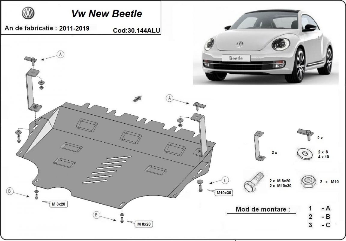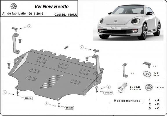Die Abschirmung schützt: motor, getriebe, kühler . Volkswagen New Beetle - 2011 und 2019. Der Unterfahrschutz ist neu und passt perfekt für alle Volkswagen New Beetle versionen, die zwischen 2011 und 2019 hergestellt wurden.Aus Aluminiumblech angefertigt mit einer Stärke von 3 mm. Die Schilde bestehen aus Aluminium, aber die Befestigungshalterungen bestehen aus Stahl. Schrauben, Mutter, Klips - alle Befestigungszubehör sind im Lieferung enthalten. Um mehr Schutz zu bieten gegen Korrosion wird der Unterfahrschutz elektrostatisch besprüht (Pulverbeschichtet) und bei 200o eingebrannt bzw. getrocknet. |
