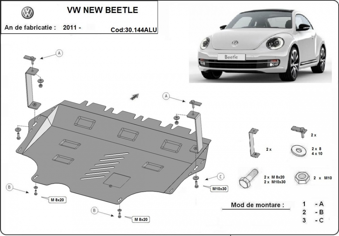 Die Abschirmung schützt: motor, getriebe, kühler . Volkswagen New Beetle - 2011 und 2017. Der Unterfahrschutz ist neu und passt perfekt für alle Volkswagen New Beetle versionen, die zwischen 2011 und 2017 hergestellt wurden.Aus Aluminiumblech angefertigt mit einer Stärke von 3 mm. Die Schilde bestehen aus Aluminium, aber die Befestigungshalterungen bestehen aus Stahl. Schrauben, Mutter, Klips - alle Befestigungszubehör sind im Lieferung enthalten. Um mehr Schutz zu bieten gegen Korrosion wird der Unterfahrschutz elektrostatisch besprüht (Pulverbeschichtet) und bei 200o eingebrannt bzw. getrocknet. |