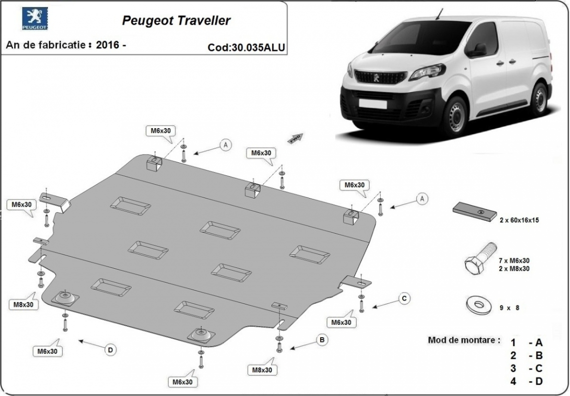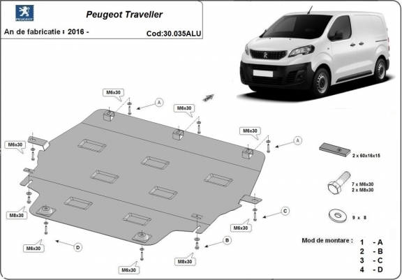 Die Abschirmung schützt: motor, getriebe, kühler . Peugeot Traveller - 2016 und 2026. Der Unterfahrschutz ist neu und passt perfekt für alle Peugeot Traveller versionen, die zwischen 2016 und 2026 hergestellt wurden.Aus Aluminiumblech angefertigt mit einer Stärke von 3 mm. Die Schilde bestehen aus Aluminium, aber die Befestigungshalterungen bestehen aus Stahl. Schrauben, Mutter, Klips - alle Befestigungszubehör sind im Lieferung enthalten. Um mehr Schutz zu bieten gegen Korrosion wird der Unterfahrschutz elektrostatisch besprüht (Pulverbeschichtet) und bei 200o eingebrannt bzw. getrocknet. |
