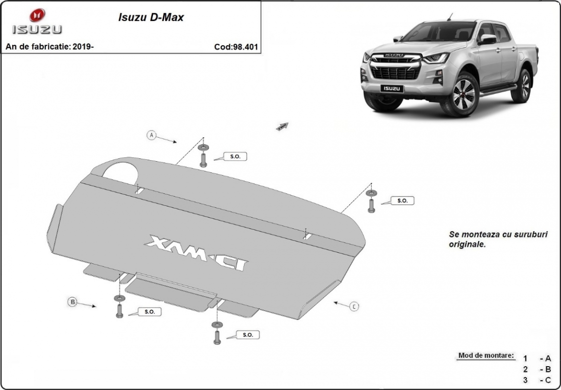 Die Abschirmung schützt: kühler . Isuzu D-Max - 2019 und 2026. Der Unterfahrschutz ist neu und passt perfekt für alle Isuzu D-Max versionen, die zwischen 2019 und 2026 hergestellt wurden.Aus Stahlblech angefertigt mit einer Stärke von 3 mm. Schrauben, Mutter, Klips - alle Befestigungszubehör sind im Lieferung enthalten. Um mehr Schutz zu bieten gegen Korrosion wird der Unterfahrschutz elektrostatisch besprüht (Pulverbeschichtet) und bei 200o eingebrannt bzw. getrocknet. |