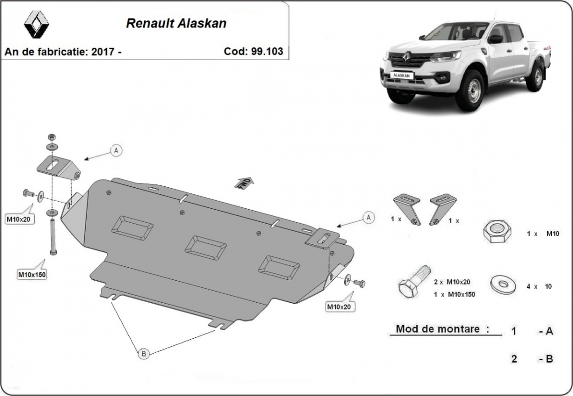 Die Abschirmung schützt: kühler . Renault Alaskan - 2017 und 2026. Der Unterfahrschutz ist neu und passt perfekt für alle Renault Alaskan versionen, die zwischen 2017 und 2026 hergestellt wurden.Aus Stahlblech angefertigt mit einer Stärke von 2 mm. Schrauben, Mutter, Klips - alle Befestigungszubehör sind im Lieferung enthalten. Um mehr Schutz zu bieten gegen Korrosion wird der Unterfahrschutz elektrostatisch besprüht (Pulverbeschichtet) und bei 200o eingebrannt bzw. getrocknet. |