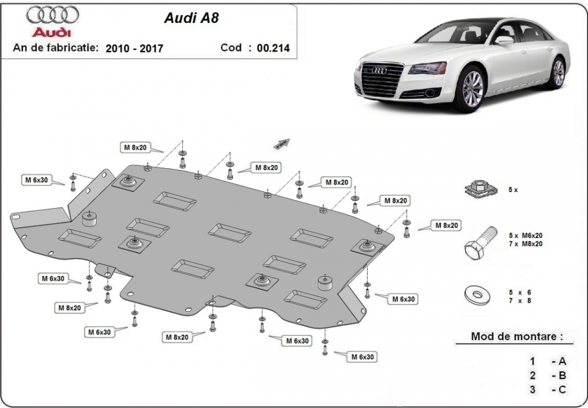 Die Abschirmung schützt: getriebe . Audi A8 - 2010 und 2017. Der Unterfahrschutz ist neu und passt perfekt für alle Audi A8 versionen, die zwischen 2010 und 2017 hergestellt wurden.Aus Stahlblech angefertigt mit einer Stärke von 2 mm. Schrauben, Mutter, Klips - alle Befestigungszubehör sind im Lieferung enthalten. Um mehr Schutz zu bieten gegen Korrosion wird der Unterfahrschutz elektrostatisch besprüht (Pulverbeschichtet) und bei 200o eingebrannt bzw. getrocknet. |