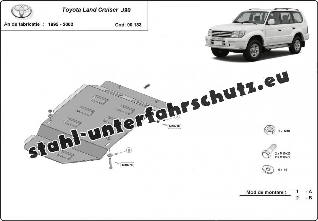 Die Abschirmung schützt: getriebe . Toyota Land Cruiser J90 - 1995 und 2002. Der Unterfahrschutz ist neu und passt perfekt für alle Toyota Land Cruiser J90 versionen, die zwischen 1995 und 2002 hergestellt wurden.Aus Stahlblech angefertigt mit einer Stärke von 2.5 mm. Schrauben, Mutter, Klips - alle Befestigungszubehör sind im Lieferung enthalten. Um mehr Schutz zu bieten gegen Korrosion wird der Unterfahrschutz elektrostatisch besprüht (Pulverbeschichtet) und bei 200o eingebrannt bzw. getrocknet. |