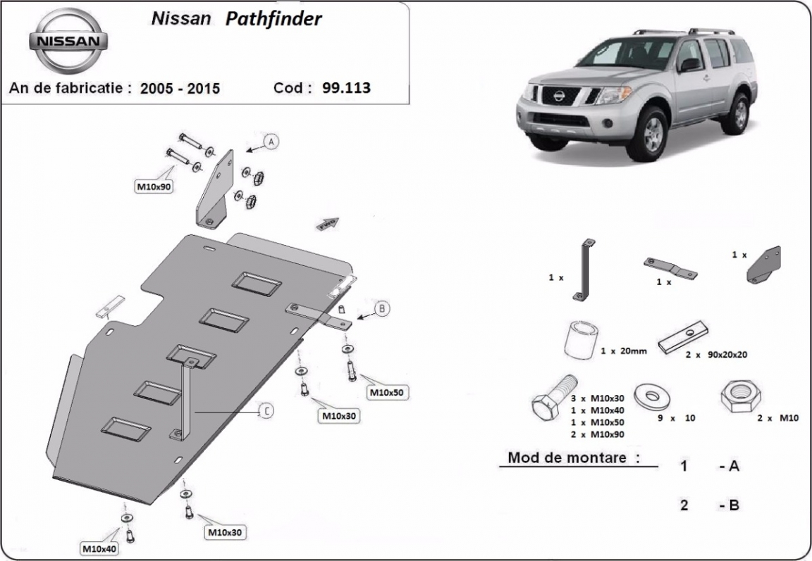 Die Abschirmung schützt: treibstofftank . Nissan Pathfinder R51 - 2005 und 2015. Der Unterfahrschutz ist neu und passt perfekt für alle Nissan Pathfinder R51 versionen, die zwischen 2005 und 2015 hergestellt wurden.Aus Stahlblech angefertigt mit einer Stärke von 2.5 mm. Schrauben, Mutter, Klips - alle Befestigungszubehör sind im Lieferung enthalten. Um mehr Schutz zu bieten gegen Korrosion wird der Unterfahrschutz elektrostatisch besprüht (Pulverbeschichtet) und bei 200o eingebrannt bzw. getrocknet. |