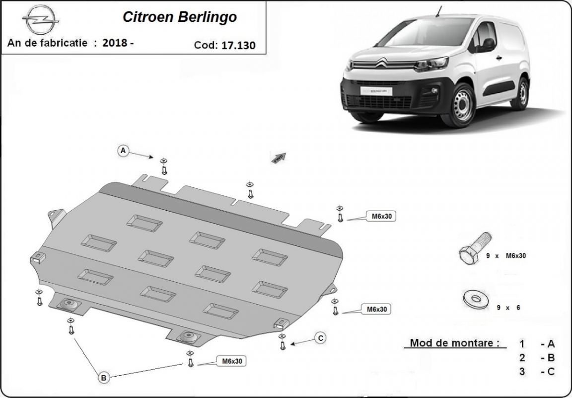 Die Abschirmung schützt: motor, getriebe, kühler . Citroen Berlingo - 2018 und 2026. Der Unterfahrschutz ist neu und passt perfekt für alle Citroen Berlingo versionen, die zwischen 2018 und 2026 hergestellt wurden.Aus Stahlblech angefertigt mit einer Stärke von 2 mm. Schrauben, Mutter, Klips - alle Befestigungszubehör sind im Lieferung enthalten. Um mehr Schutz zu bieten gegen Korrosion wird der Unterfahrschutz elektrostatisch besprüht (Pulverbeschichtet) und bei 200o eingebrannt bzw. getrocknet. |