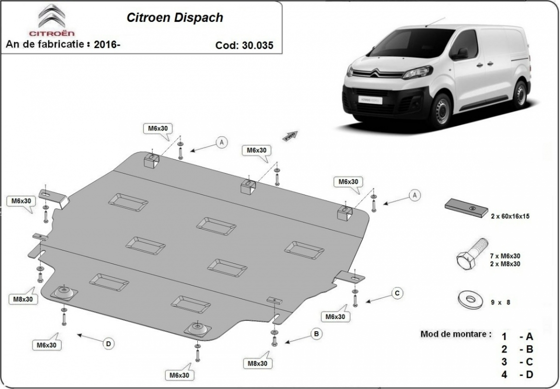 Die Abschirmung schützt: motor, getriebe, kühler . Citroen Dispatch - 2016 und 2026. Der Unterfahrschutz ist neu und passt perfekt für den Citroen Dispatch mit den folgenden Motor- / Antriebsversionen: toTE - hergestellt zwischen 2016 und 2026.Aus Stahlblech angefertigt mit einer Stärke von 2 mm. Schrauben, Mutter, Klips - alle Befestigungszubehör sind im Lieferung enthalten. Um mehr Schutz zu bieten gegen Korrosion wird der Unterfahrschutz elektrostatisch besprüht (Pulverbeschichtet) und bei 200o eingebrannt bzw. getrocknet. |
