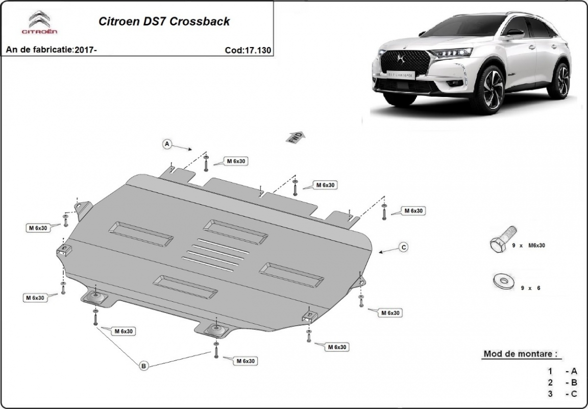 Die Abschirmung schützt: motor, getriebe, kühler . Citroen C4 - 2017 und 2026. Der Unterfahrschutz ist neu und passt perfekt für alle Citroen C4 versionen, die zwischen 2017 und 2026 hergestellt wurden.Aus Stahlblech angefertigt mit einer Stärke von 2 mm. Schrauben, Mutter, Klips - alle Befestigungszubehör sind im Lieferung enthalten. Um mehr Schutz zu bieten gegen Korrosion wird der Unterfahrschutz elektrostatisch besprüht (Pulverbeschichtet) und bei 200o eingebrannt bzw. getrocknet. |