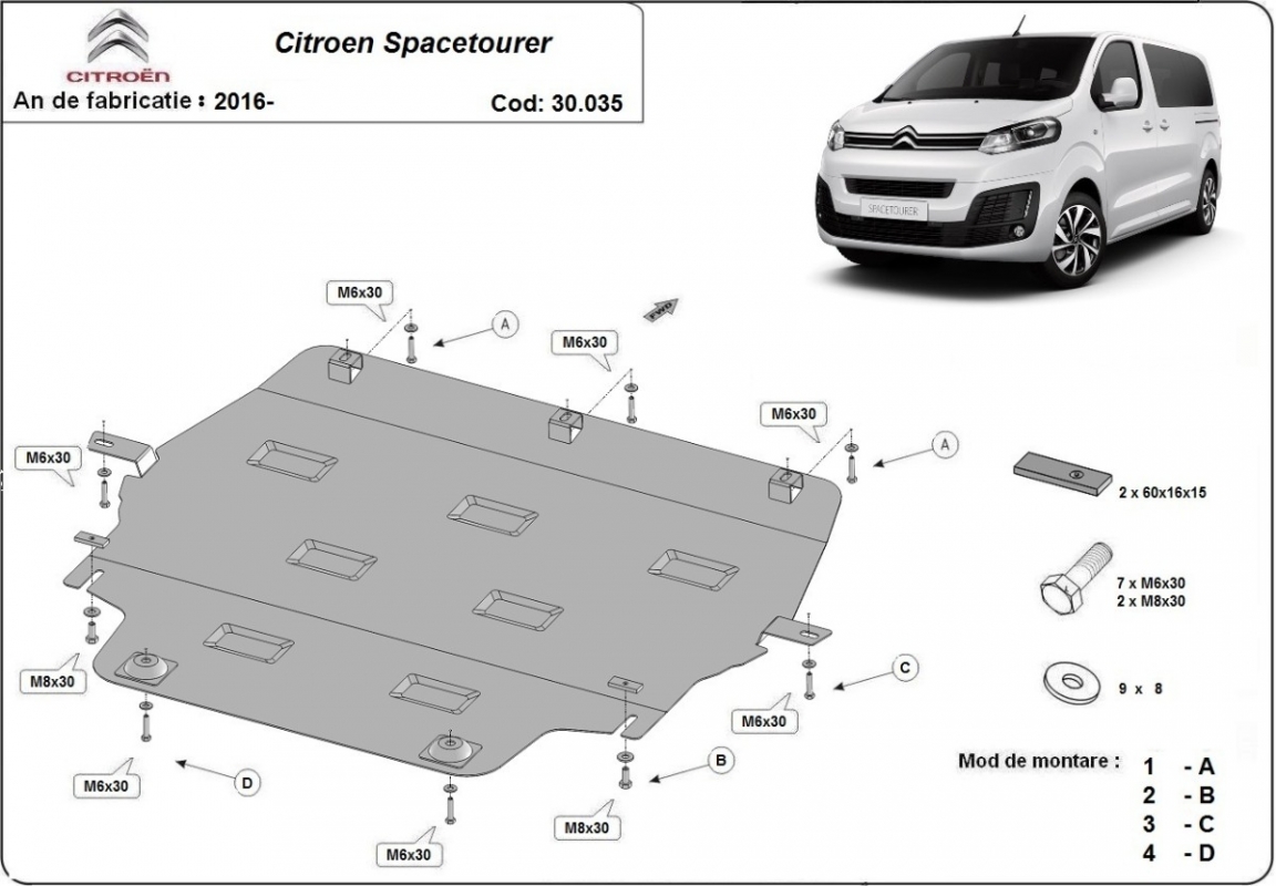 Die Abschirmung schützt: motor, getriebe, kühler . Citroen Spacetourer - 2016 und 2026. Der Unterfahrschutz ist neu und passt perfekt für alle Citroen Spacetourer versionen, die zwischen 2016 und 2026 hergestellt wurden.Aus Stahlblech angefertigt mit einer Stärke von 2 mm. Schrauben, Mutter, Klips - alle Befestigungszubehör sind im Lieferung enthalten. Um mehr Schutz zu bieten gegen Korrosion wird der Unterfahrschutz elektrostatisch besprüht (Pulverbeschichtet) und bei 200o eingebrannt bzw. getrocknet. |