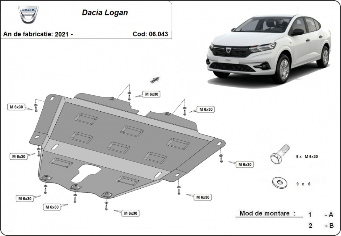 Die Abschirmung schützt: motor, getriebe . Dacia Logan - 2021 und 2026. Der Unterfahrschutz ist neu und passt perfekt für alle Dacia Logan versionen, die zwischen 2021 und 2026 hergestellt wurden.Aus Stahlblech angefertigt mit einer Stärke von 2 mm. Schrauben, Mutter, Klips - alle Befestigungszubehör sind im Lieferung enthalten. Um mehr Schutz zu bieten gegen Korrosion wird der Unterfahrschutz elektrostatisch besprüht (Pulverbeschichtet) und bei 200o eingebrannt bzw. getrocknet. |