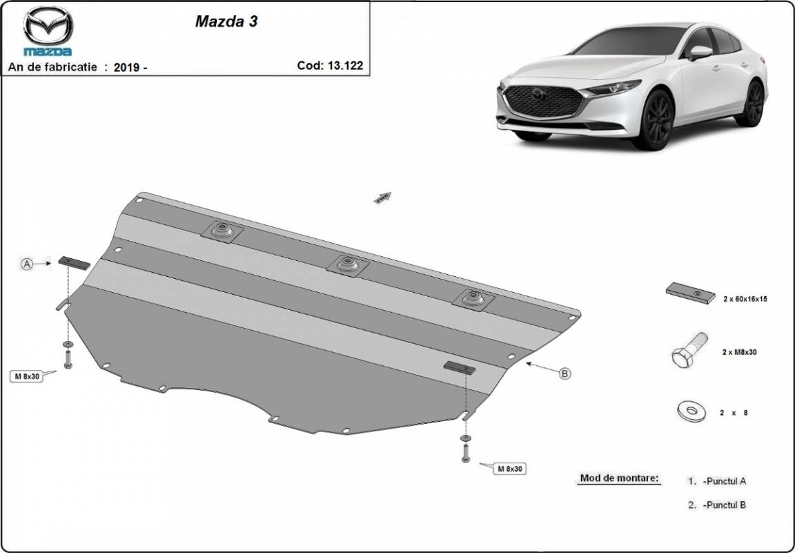 Die Abschirmung schützt: motor, getriebe . Mazda 3 - 2019 und 2026. Der Unterfahrschutz ist neu und passt perfekt für alle Mazda 3 versionen, die zwischen 2019 und 2026 hergestellt wurden.Aus Stahlblech angefertigt mit einer Stärke von 2 mm. Schrauben, Mutter, Klips - alle Befestigungszubehör sind im Lieferung enthalten. Um mehr Schutz zu bieten gegen Korrosion wird der Unterfahrschutz elektrostatisch besprüht (Pulverbeschichtet) und bei 200o eingebrannt bzw. getrocknet. |