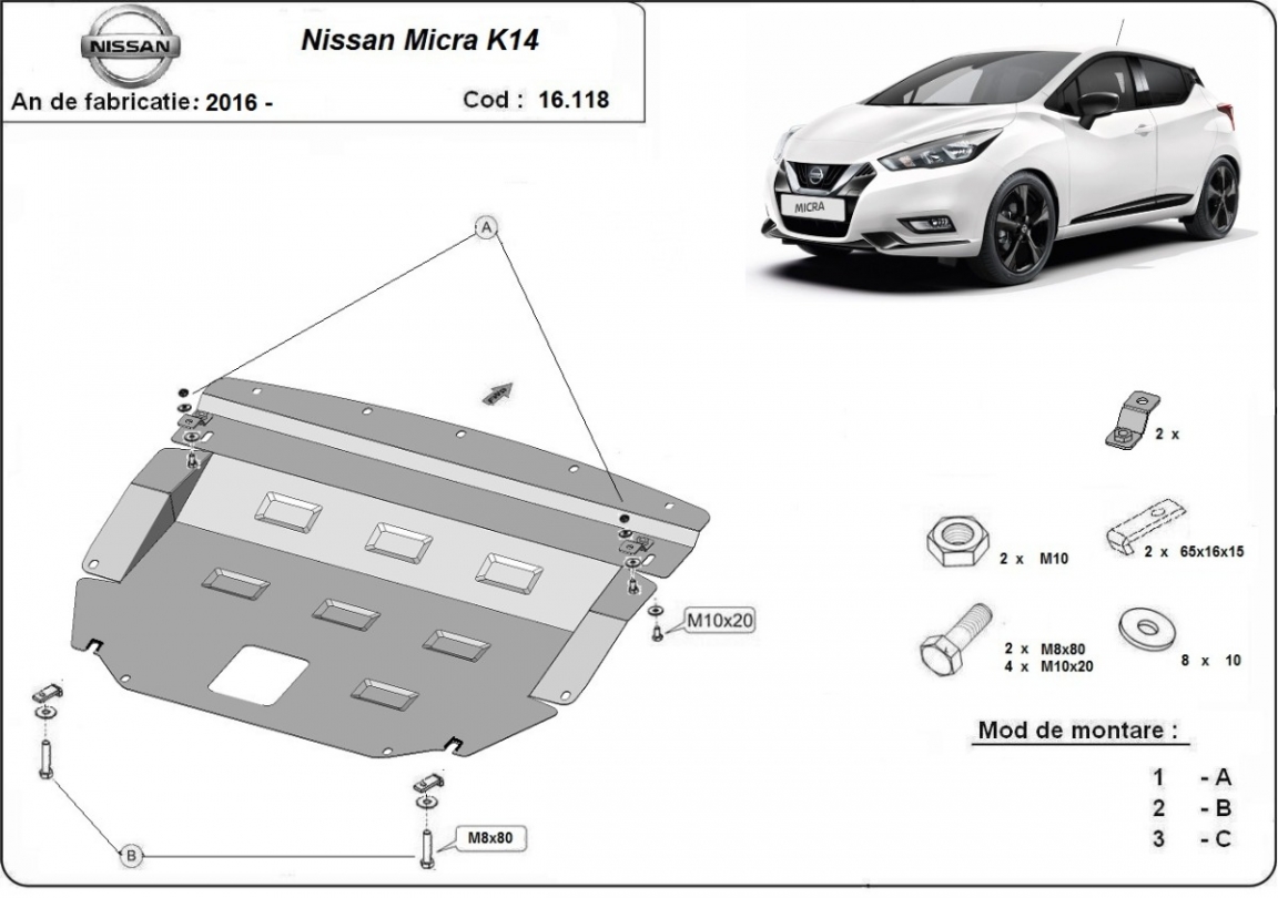 Die Abschirmung schützt: motor, getriebe, kühler . Nissan Micra - 2016 und 2026. Der Unterfahrschutz ist neu und passt perfekt für alle Nissan Micra versionen, die zwischen 2016 und 2026 hergestellt wurden.Aus Stahlblech angefertigt mit einer Stärke von 2 mm. Schrauben, Mutter, Klips - alle Befestigungszubehör sind im Lieferung enthalten. Um mehr Schutz zu bieten gegen Korrosion wird der Unterfahrschutz elektrostatisch besprüht (Pulverbeschichtet) und bei 200o eingebrannt bzw. getrocknet. |