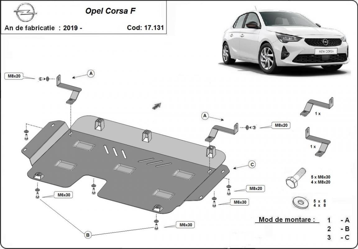 Die Abschirmung schützt: motor, getriebe, kühler . Opel Corsa F - 2019 und 2026. Der Unterfahrschutz ist neu und passt perfekt für alle Opel Corsa F versionen, die zwischen 2019 und 2026 hergestellt wurden.Aus Stahlblech angefertigt mit einer Stärke von 2 mm. Schrauben, Mutter, Klips - alle Befestigungszubehör sind im Lieferung enthalten. Um mehr Schutz zu bieten gegen Korrosion wird der Unterfahrschutz elektrostatisch besprüht (Pulverbeschichtet) und bei 200o eingebrannt bzw. getrocknet. |