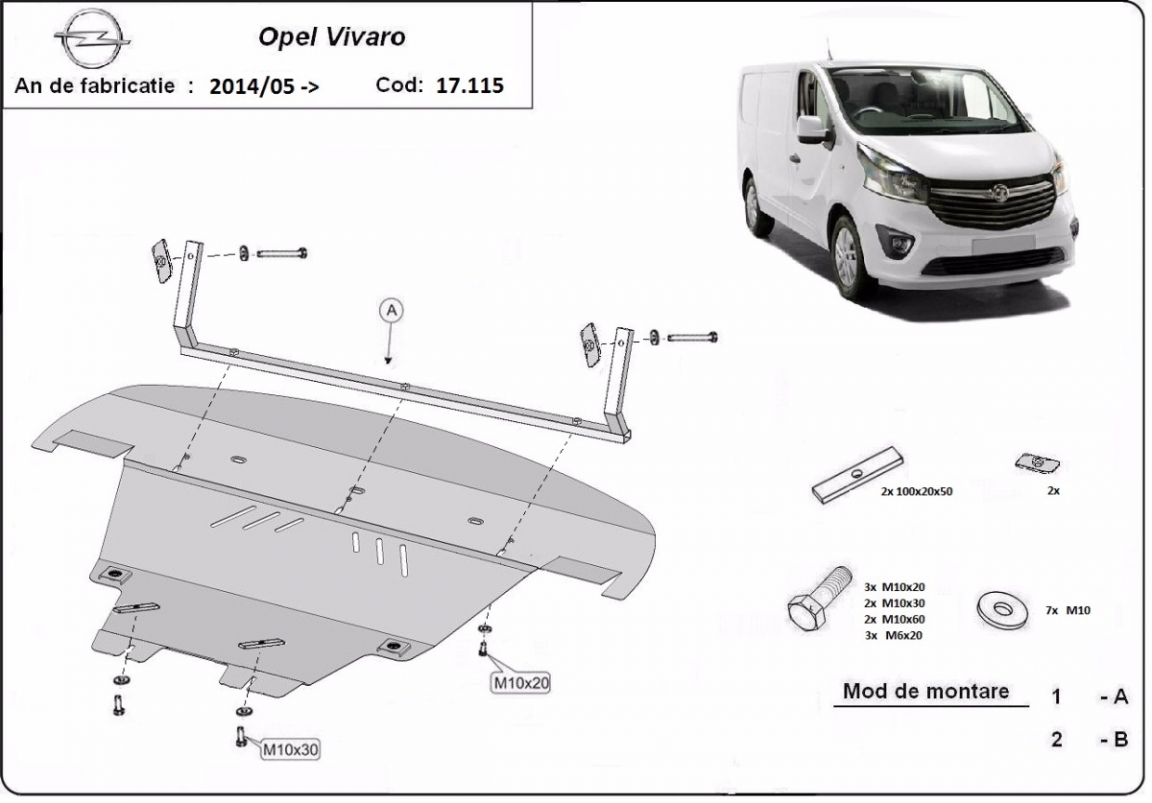 Die Abschirmung schützt: motor, getriebe, kühler, vordere stossfänger . Opel Vivaro - 2014 und 2019. Der Unterfahrschutz ist neu und passt perfekt für alle Opel Vivaro versionen, die zwischen 2014 und 2019 hergestellt wurden.Aus Stahlblech angefertigt mit einer Stärke von 2 mm. Schrauben, Mutter, Klips - alle Befestigungszubehör sind im Lieferung enthalten. Um mehr Schutz zu bieten gegen Korrosion wird der Unterfahrschutz elektrostatisch besprüht (Pulverbeschichtet) und bei 200o eingebrannt bzw. getrocknet. |