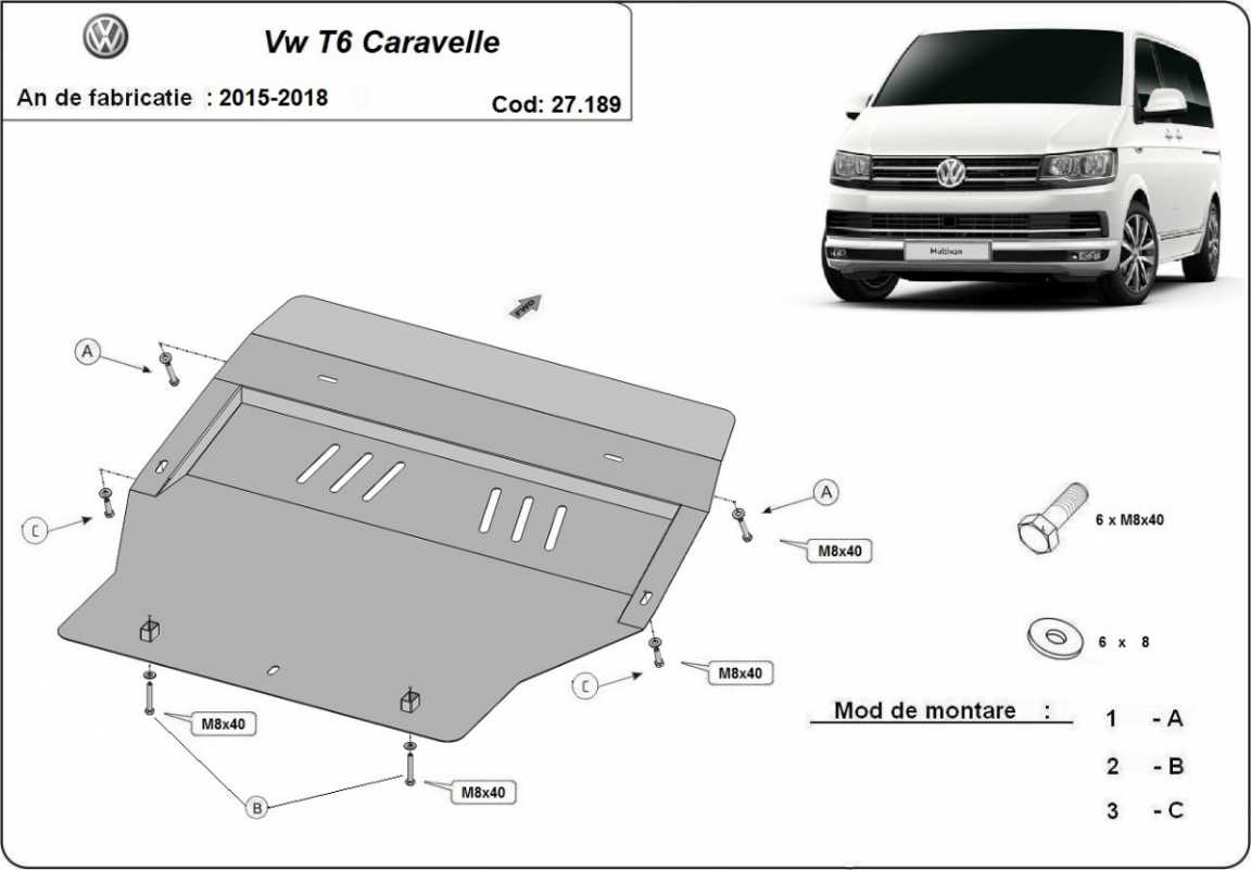 Die Abschirmung schützt: motor, getriebe, kühler, vordere stossfänger . Volkswagen Transporter T6 - Caravelle - 2015 und 2026. Der Unterfahrschutz ist neu und passt perfekt für alle Volkswagen Transporter T6 - Caravelle versionen, die zwischen 2015 und 2026 hergestellt wurden.Aus Stahlblech angefertigt mit einer Stärke von 2 mm. Schrauben, Mutter, Klips - alle Befestigungszubehör sind im Lieferung enthalten. Um mehr Schutz zu bieten gegen Korrosion wird der Unterfahrschutz elektrostatisch besprüht (Pulverbeschichtet) und bei 200o eingebrannt bzw. getrocknet. |