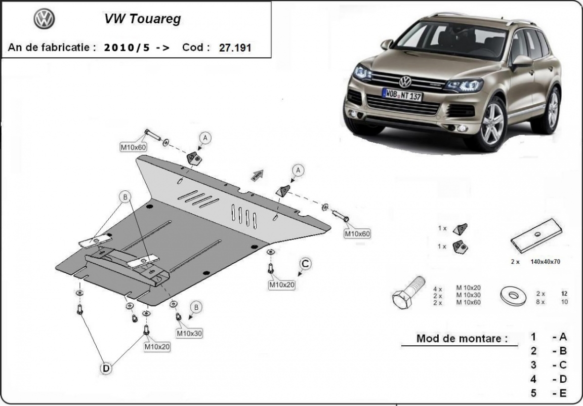 Die Abschirmung schützt: motor . VW Touareg - 2010 und 2018. Der Unterfahrschutz ist neu und passt perfekt für alle VW Touareg versionen, die zwischen 2010 und 2018 hergestellt wurden.Aus Stahlblech angefertigt mit einer Stärke von 2,5 mm. Schrauben, Mutter, Klips - alle Befestigungszubehör sind im Lieferung enthalten. Um mehr Schutz zu bieten gegen Korrosion wird der Unterfahrschutz elektrostatisch besprüht (Pulverbeschichtet) und bei 200o eingebrannt bzw. getrocknet. |
