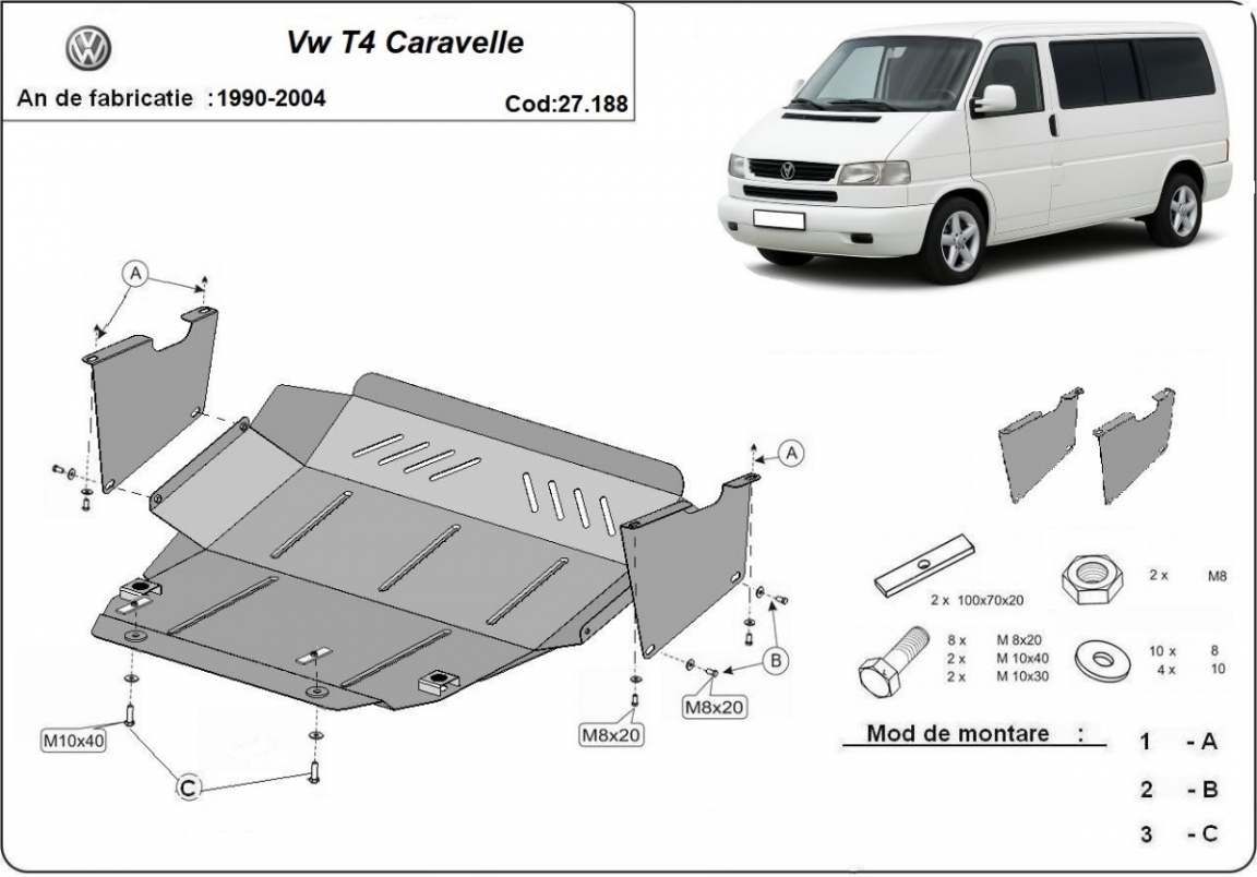 Die Abschirmung schützt: motor, getriebe . Transporter T4 Caravelle - 1990 und 2003. Der Unterfahrschutz ist neu und passt perfekt für alle Transporter T4 Caravelle versionen, die zwischen 1990 und 2003 hergestellt wurden.Aus Stahlblech angefertigt mit einer Stärke von 2 mm. Schrauben, Mutter, Klips - alle Befestigungszubehör sind im Lieferung enthalten. Um mehr Schutz zu bieten gegen Korrosion wird der Unterfahrschutz elektrostatisch besprüht (Pulverbeschichtet) und bei 200o eingebrannt bzw. getrocknet. |
