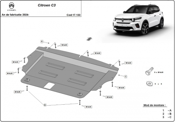 Die Abschirmung schützt: motor, getriebe . Citroen C3 - 2024 und 2026. Der Unterfahrschutz ist neu und passt perfekt für alle Citroen C3 versionen, die zwischen 2024 und 2026 hergestellt wurden.Aus Stahlblech angefertigt mit einer Stärke von 2 mm. Schrauben, Mutter, Klips - alle Befestigungszubehör sind im Lieferung enthalten. Um mehr Schutz zu bieten gegen Korrosion wird der Unterfahrschutz elektrostatisch besprüht (Pulverbeschichtet) und bei 200o eingebrannt bzw. getrocknet. |