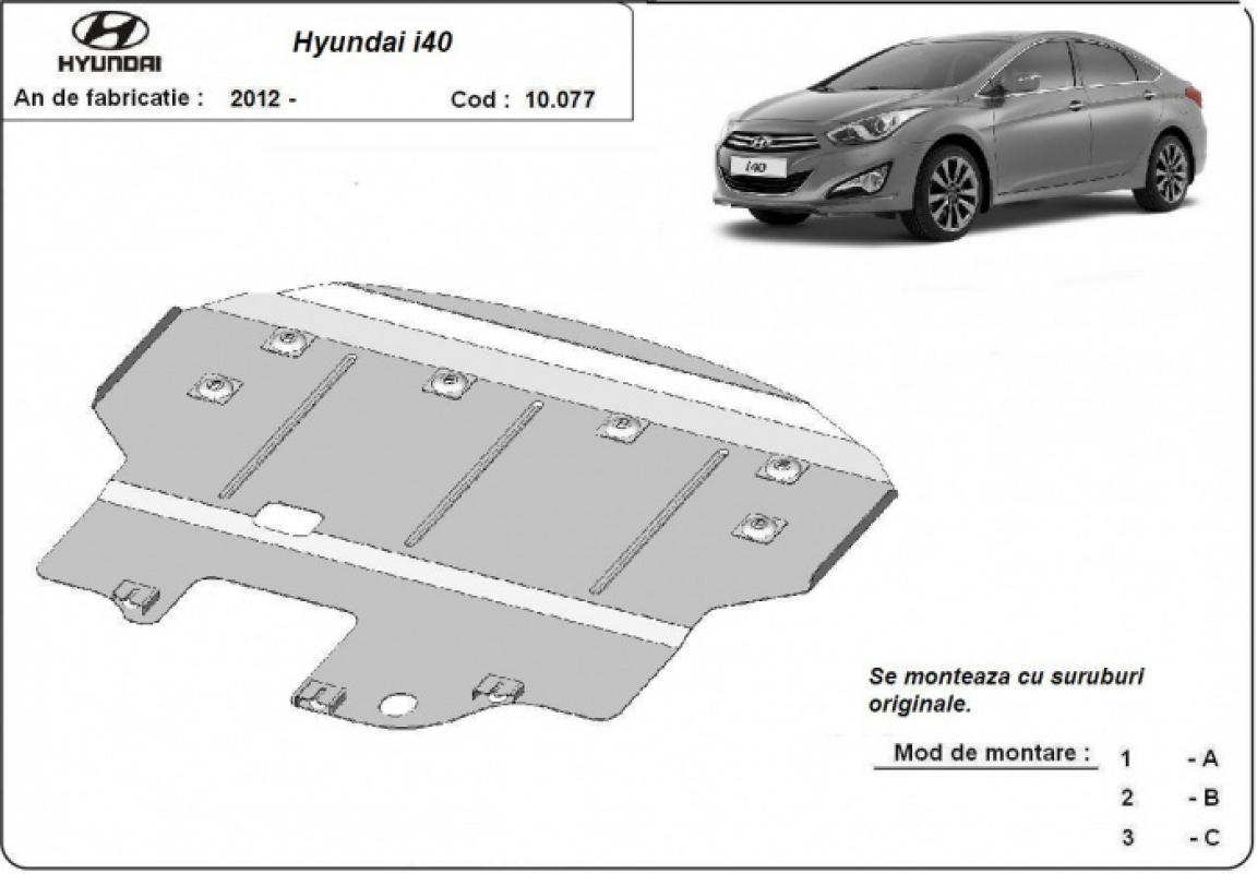 Die Abschirmung schützt: motor, getriebe . Hyundai i40 - 2011 und 2015. Der Unterfahrschutz ist neu und passt perfekt für alle Hyundai i40 versionen, die zwischen 2011 und 2015 hergestellt wurden.Aus Stahlblech angefertigt mit einer Stärke von 2 mm. Schrauben, Mutter, Klips - alle Befestigungszubehör sind im Lieferung enthalten. Um mehr Schutz zu bieten gegen Korrosion wird der Unterfahrschutz elektrostatisch besprüht (Pulverbeschichtet) und bei 200o eingebrannt bzw. getrocknet. |