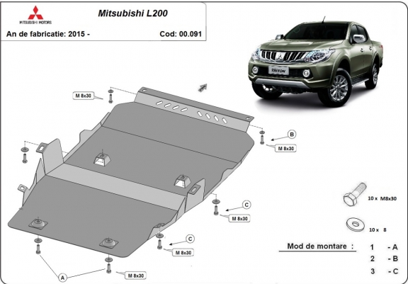 Die Abschirmung schützt: motor, getriebe, Verteilergetriebe . Mitsubishi L200 - 2015 und 2026. Der Unterfahrschutz ist neu und passt perfekt für alle Mitsubishi L200 versionen, die zwischen 2015 und 2026 hergestellt wurden.Aus Stahlblech angefertigt mit einer Stärke von 2.5 mm. Schrauben, Mutter, Klips - alle Befestigungszubehör sind im Lieferung enthalten. Um mehr Schutz zu bieten gegen Korrosion wird der Unterfahrschutz elektrostatisch besprüht (Pulverbeschichtet) und bei 200o eingebrannt bzw. getrocknet. |