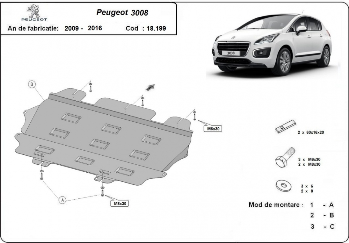 Die Abschirmung schützt: motor, getriebe . Peugeot 3008 - 2009 und 2016. Der Unterfahrschutz ist neu und passt perfekt für alle Peugeot 3008 versionen, die zwischen 2009 und 2016 hergestellt wurden.Aus Stahlblech angefertigt mit einer Stärke von 2 mm. Schrauben, Mutter, Klips - alle Befestigungszubehör sind im Lieferung enthalten. Um mehr Schutz zu bieten gegen Korrosion wird der Unterfahrschutz elektrostatisch besprüht (Pulverbeschichtet) und bei 200o eingebrannt bzw. getrocknet. |
