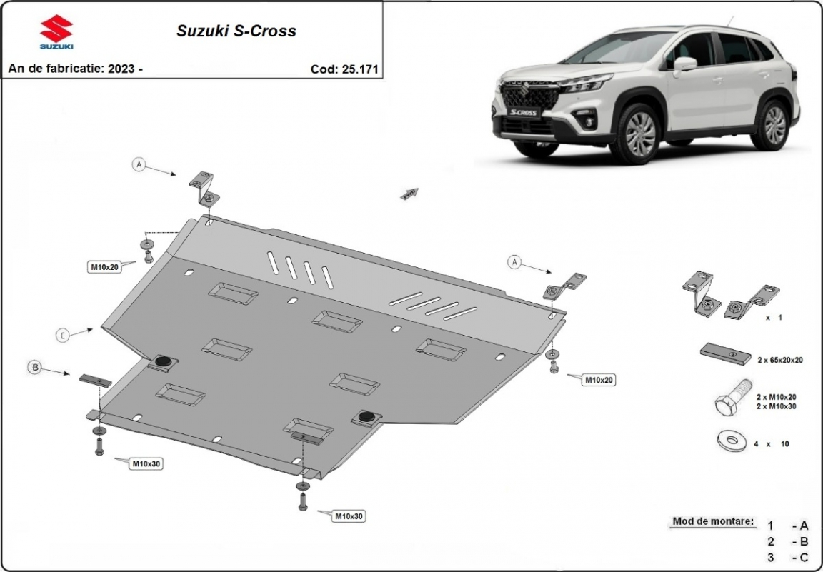 Die Abschirmung schützt: motor, getriebe . Suzuki S-Cross - 2023 und 2026. Der Unterfahrschutz ist neu und passt perfekt für alle Suzuki S-Cross versionen, die zwischen 2023 und 2026 hergestellt wurden.Aus Stahlblech angefertigt mit einer Stärke von 2 mm. Schrauben, Mutter, Klips - alle Befestigungszubehör sind im Lieferung enthalten. Um mehr Schutz zu bieten gegen Korrosion wird der Unterfahrschutz elektrostatisch besprüht (Pulverbeschichtet) und bei 200o eingebrannt bzw. getrocknet. |