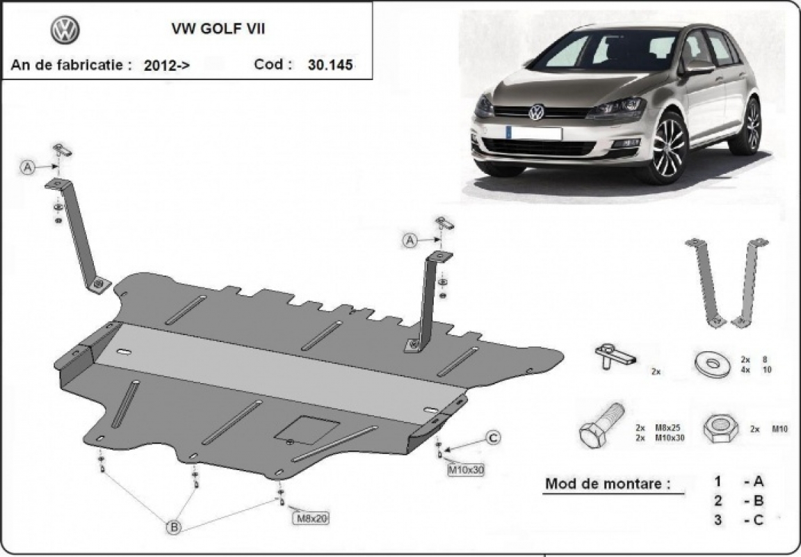 Die Abschirmung schützt: motor, getriebe, kühler, vordere stossfänger . VW Golf 7 - 2012 und 2020. Der Unterfahrschutz ist neu und passt perfekt für alle VW Golf 7 versionen, die zwischen 2012 und 2020 hergestellt wurden.Aus Stahlblech angefertigt mit einer Stärke von 2 mm. Schrauben, Mutter, Klips - alle Befestigungszubehör sind im Lieferung enthalten. Um mehr Schutz zu bieten gegen Korrosion wird der Unterfahrschutz elektrostatisch besprüht (Pulverbeschichtet) und bei 200o eingebrannt bzw. getrocknet. |