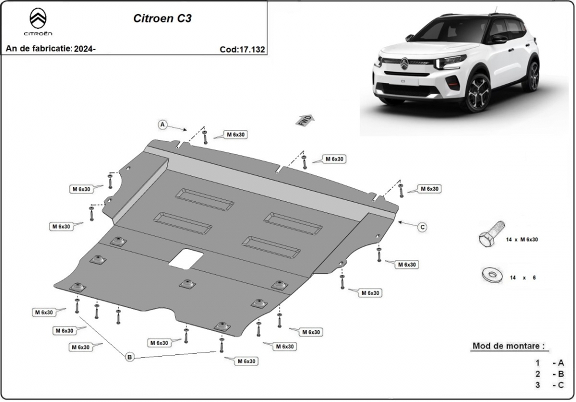 Die Abschirmung schützt: motor, getriebe . Citroen C3 - 2024 und 2026. Der Unterfahrschutz ist neu und passt perfekt für alle Citroen C3 versionen, die zwischen 2024 und 2026 hergestellt wurden.Aus Stahlblech angefertigt mit einer Stärke von 2 mm. Schrauben, Mutter, Klips - alle Befestigungszubehör sind im Lieferung enthalten. Um mehr Schutz zu bieten gegen Korrosion wird der Unterfahrschutz elektrostatisch besprüht (Pulverbeschichtet) und bei 200o eingebrannt bzw. getrocknet. |